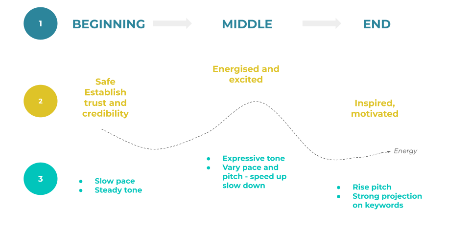 Start by focussing on 2 vocal levers you can pull on for each stage and write them down