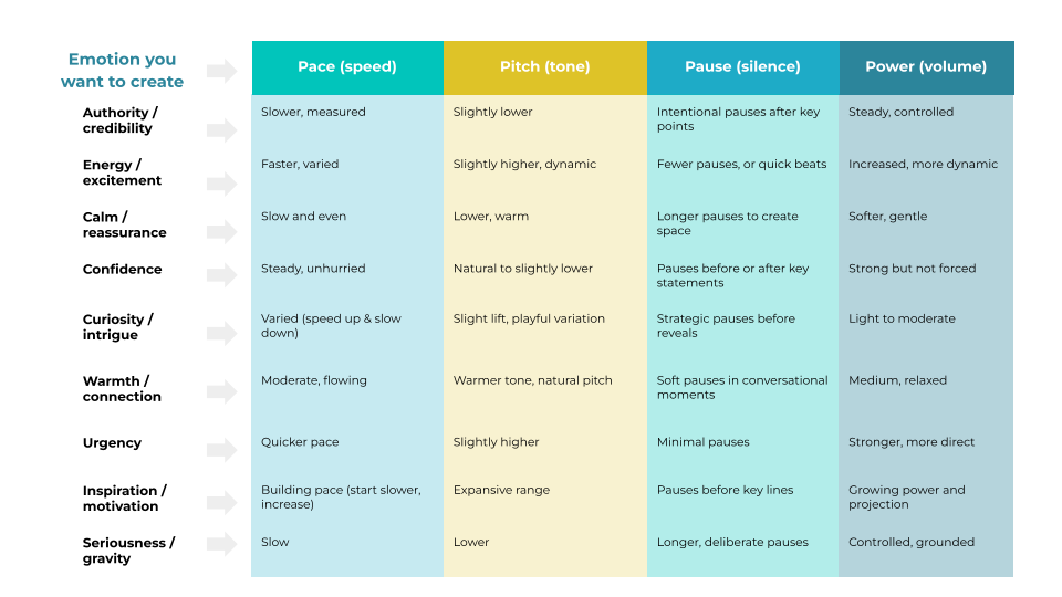 If in doubt: slow down, pause more, and vary your tone. Most people need less speed and more intention, rather than more words.